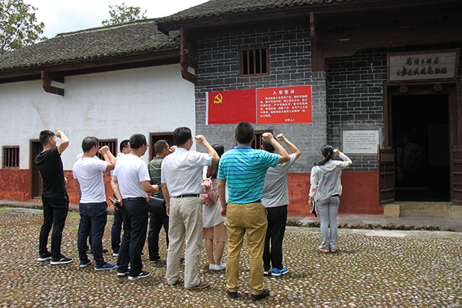 隨后,一行人到達水口鎮(zhèn)連隊建黨舊址。水口鎮(zhèn)連隊建黨舊址——葉家祠1972年被公布為湖南省重點文物保護單位,已被定為株洲市愛國主義教育基地。祠堂門口懸掛著鮮明的黨旗及入黨誓詞,肅穆莊嚴(yán),公司黨員在此重新宣讀入黨誓詞,內(nèi)心激動澎湃的感情溢于言表。誓詞提醒著每一位黨員的承諾與信仰,他們將牢記自己的使命,從群眾中來到群眾中去,發(fā)揮黨員帶頭作用。